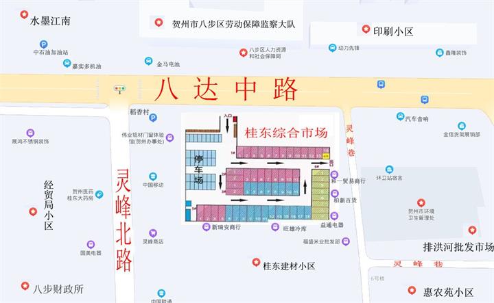 地址位于贺州市八达中路32号,地理位置优越,在灵峰北路与八达中路交界处,属贺州市城区杂货批发商圈核心,一墙之隔有三大电信运营商,人流密集、交通便利。